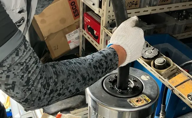 当社の基幹事業は、油圧ホースの現地製作・交換です。建設機械、クレーン車、キャリアカーなどに使用される油圧ホースが劣化・破損し、油漏れが発生した際、専用の機械を積載した工作車で迅速に現場へ急行します。その場で高品質なホースを製作・交換し、お客様の機械のダウンタイムを最小限に抑えます。海外製の口金具も取り扱っており、幅広いニーズに対応可能です。