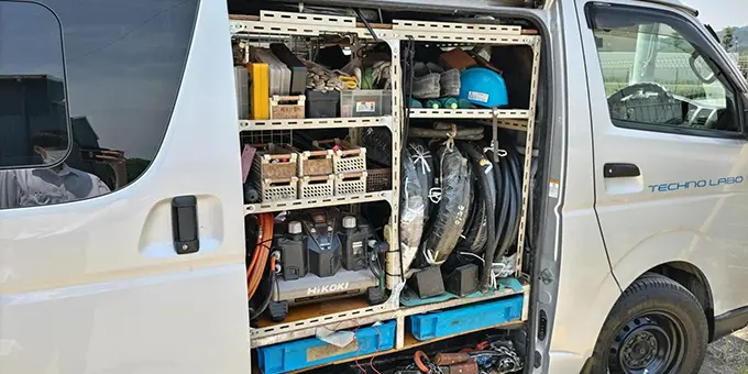 専用車両で現場へ直行し、その場で油圧ホースの製作・交換を行います。