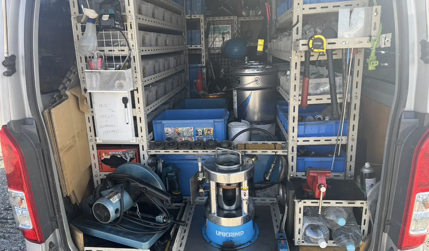 専用車両で現場へ直行し、その場で油圧ホースの製作・交換を行います。